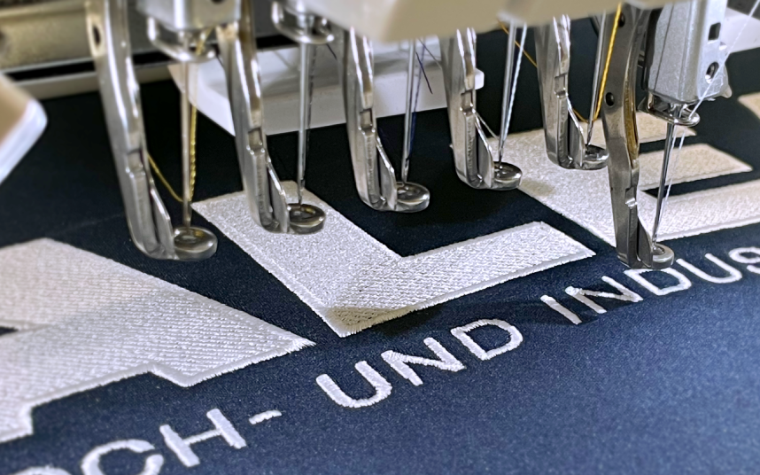 Die hochwertigste und edelste Form der Textilveredelung ist die Stickerei. Bestickte Textilien überzeugen durch ihre 3D-Optik und dem eindrucksvollen Glanz der verwendeten Qualitätsgarne. Neben einer sehr guten Waschbeständigkeit, zeichnen sich diese durch Licht- und Kochechtheit aus. Die verwendeten Garne entsprechen dem Öko-Tex Standard 100.